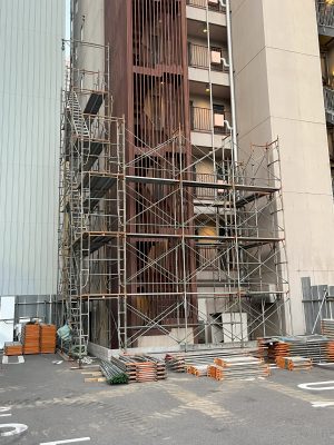 ここは、現場の敷地が狭いので単管足場です。